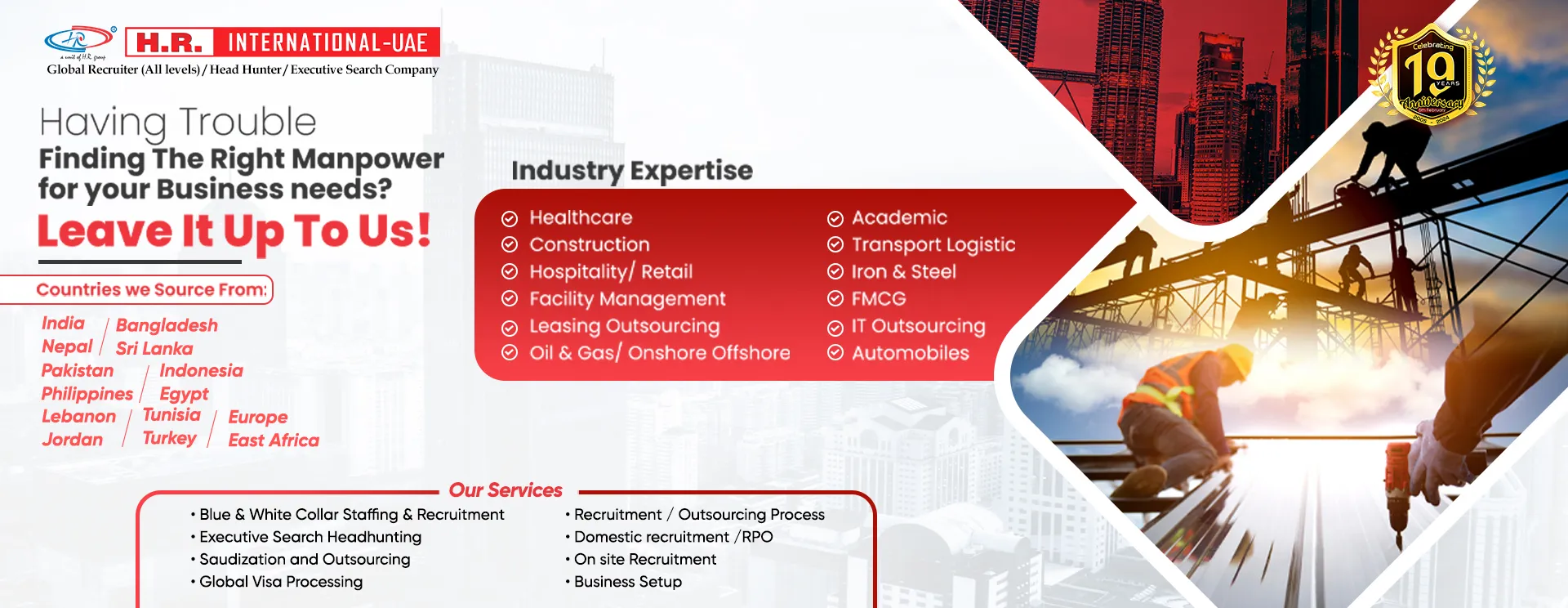 HR International is very well known to serve blue collar industry with their expertise and experienced staff. With our vast database, we proffer jobs in fields like mason, carpenter, plumber, electrician, painter etc and help achieve dreams of many candidates who are waiting to settle down overseas. The company offers their clients with well qualified and enabled work forces and is also proved to be the best in executive search, recruitment and outsourcing.